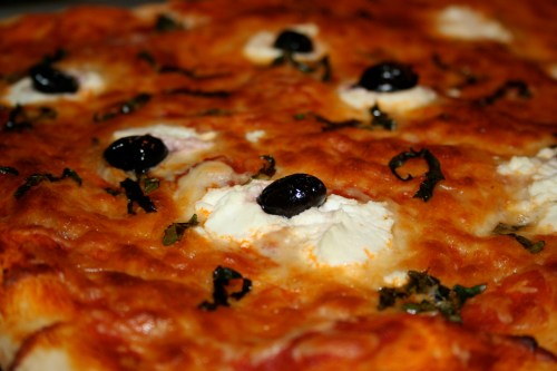 I make the dough in my bread machine, then do a miserably amateur job of tossing, stretching and hanging the dough before ultimately beating it into a large jelly roll pan (more like a focaccia). Cover with sauce, shredded mozzarella, fresh ricotta, basil (I do a chiffonade), and a Spanish cured black olive to top off each mound of ricotta.
