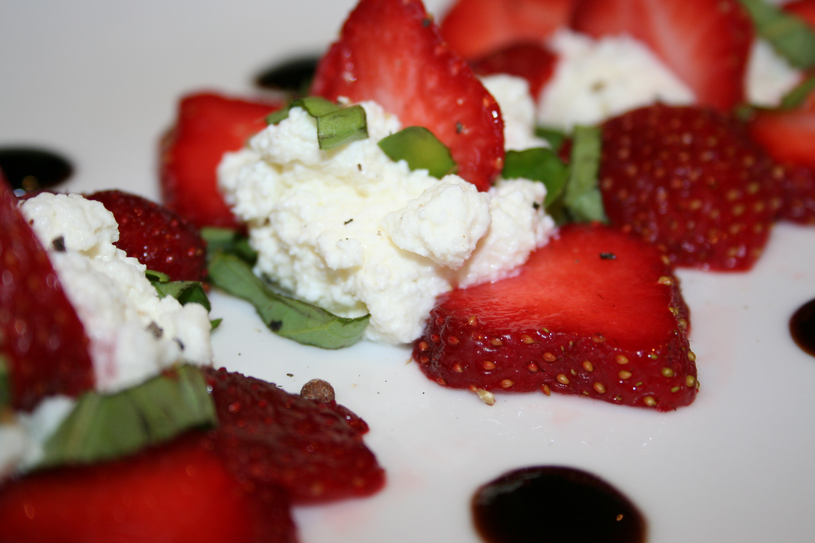 One of the joys of the farmer’s market for me this year has been trying out fresh cheeses as well. A special favorite has been fresh ricotta, which has been making appearances in several places. The first time I brought some home, I was feeling a little cheeky in the kitchen and put together the following dish of strawberries, ricotta, basil, sea salt, pepper and a store-bought balsamic glaze called “Blaze.” I should mention that I LOVE this stuff and use it all the time. Highly recommended. Unfortunately for me, the dish itself was prettier than it tasted.
