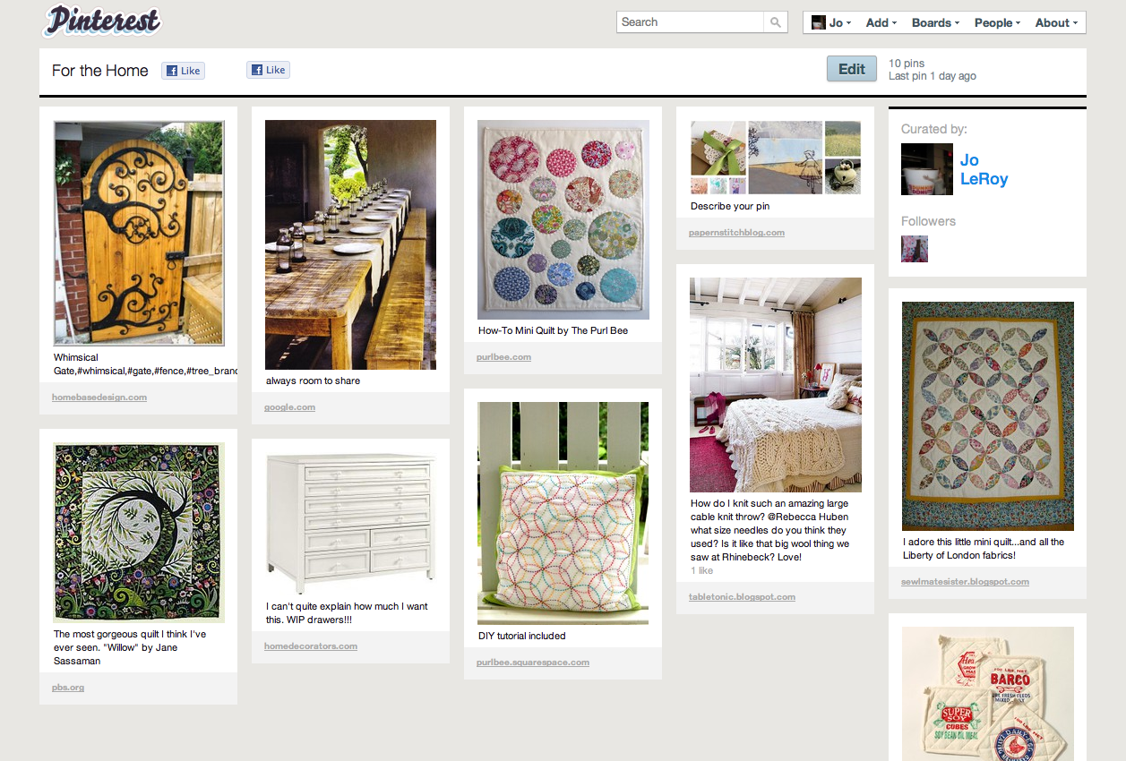 Wasn’t that fun? On a related note, I really enjoy sharing fun finds, blogs, tutorials and the like with people who will appreciate them. Translation: I annoyingly spam my friends’ and family’s inboxes with hyperlinks on a regular basis. I recently got an invite to join Pinterest, and am totally hooked! Basically, Pinterest works like a virtual pinboard, where you can store all your bookmarks, but see them as photos. For a visual person like myself (who generally operates under the “out of sight, out of mind” principle), this thing is genius. I already have my recipes covered with Recipe Nut, and will stick with that for food, but Pinterest is already fantastic for tutorials and wedding inspiration. You can find me on Pinterest here; joining is by invite only, so if you’d like to join, just drop me a line and I’ll be happy to send you an invite. Here’s a sample of what one of my pinboards looks like: