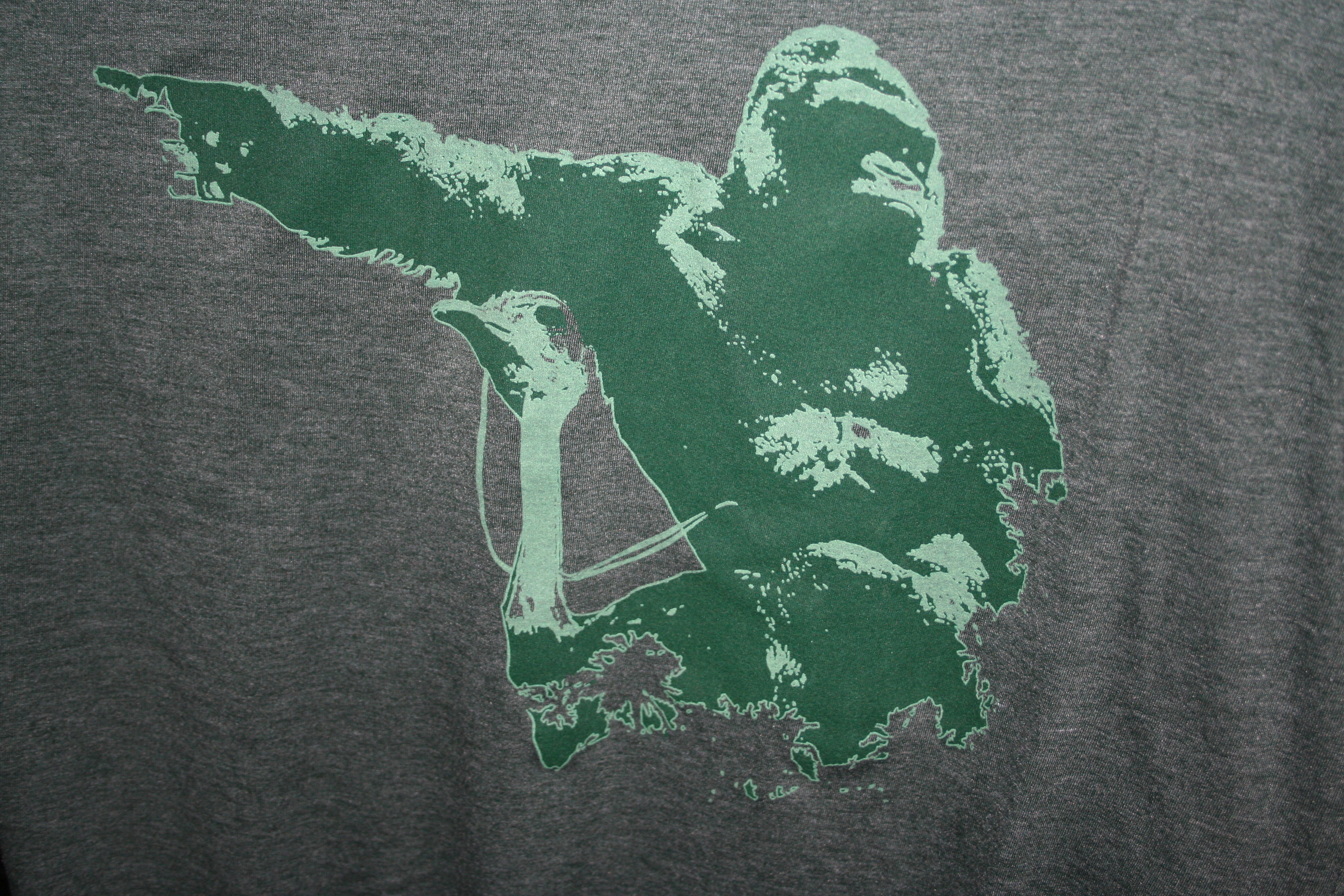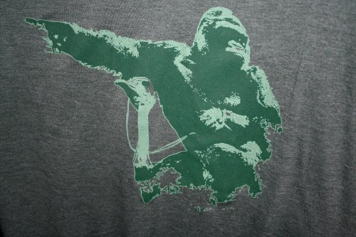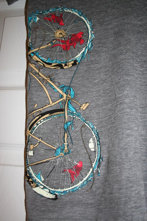 Or take a look at this lovely, which, yes, did come home with me — a wonderful artist’s representation of the old feminist slogan “A woman needs a man like a fish needs a bicycle” on a women’s grey v-neck tee. (both t-shirts from www.sharpshirter.com)